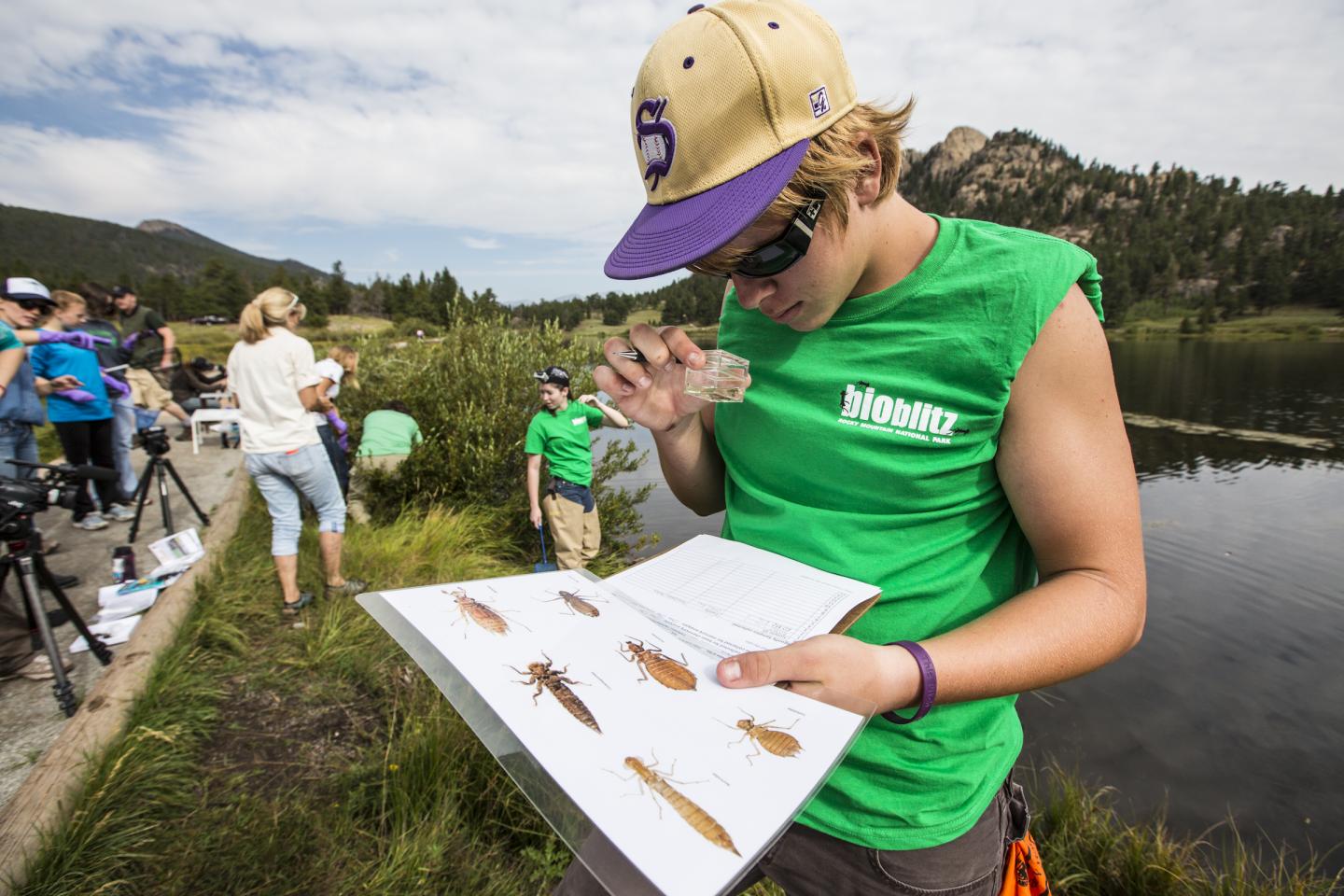 image: A volunteer participates in a BioBlitz at Rocky Mountain National Park. BioBlitz events (an intensive field study in an area usually over 24 hours) can be helpful for identifying the presence of invasive species in national parks.
