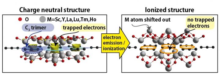 image: Yellow isosurfaces on left panel indicate electrons localized in-between the C3 trimers. Ionized structure on the right has no trapped electrons, and some of the M atoms have been largely displaced. This displacement of the M atoms again significantly stabilizes the ionized structure.