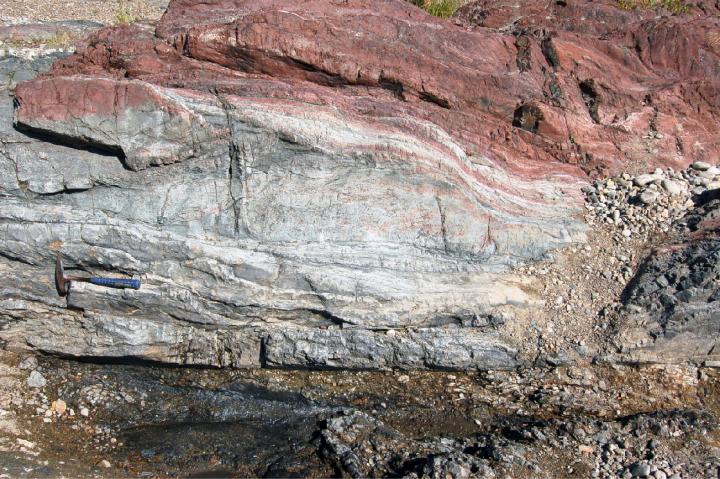image: The outcrop of the pseudotachylyte-bearing fault zone in pelagic sedimentary rocks.