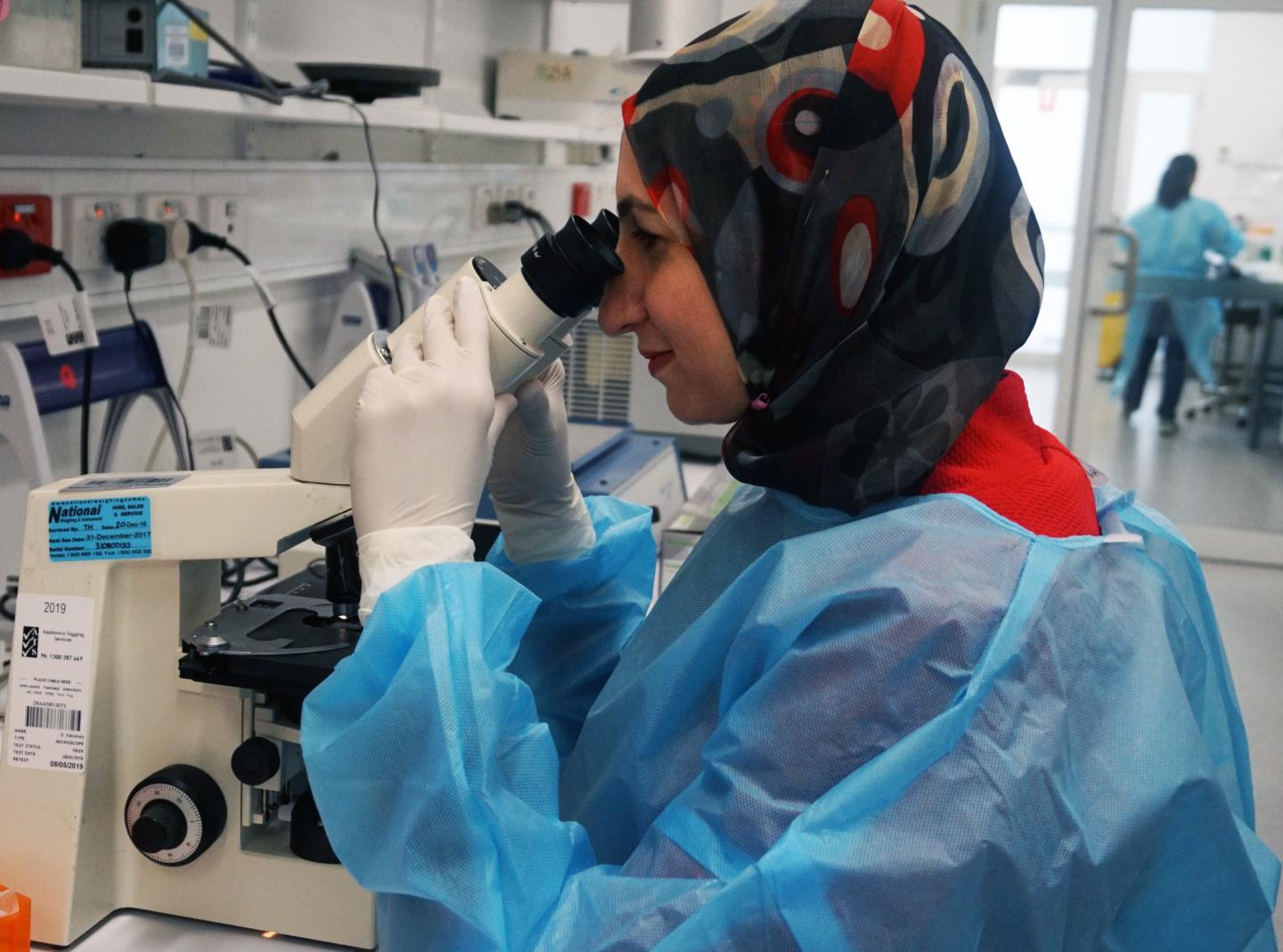 image: This is Dr. Mayada Metwally looking down a microscope.