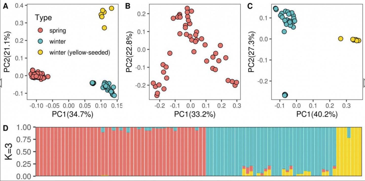 image: Population structure of Russian rapeseed lines. Population structure assessed using principal component analysis for the whole cohort (A), spring (B), and winter (C) types separately. Red dots correspond to spring rapeseed accessions. Blue dots correspond to winter rapeseed accessions. Yellow dots correspond to yellow-seeded winter rapeseed accessions. (D) Population clustering of rapeseed lines based on the admixture component of each accession, the bar colors correspond to the dot colors in panel A.