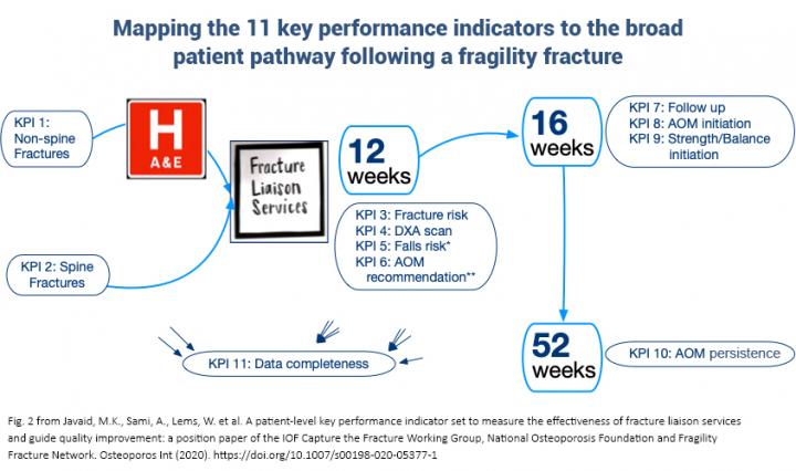image: Adapted Fig. 2 from Javaid, M.K., Sami, A., Lems, W. et al. A patient-level key performance indicator set to measure the effectiveness of fracture liaison services and guide quality improvement: a position paper of the IOF Capture the Fracture Working Group, National Osteoporosis Foundation and Fragility Fracture Network. Osteoporos Int (2020). https://doi.org/10.1007/s00198-020-05377-1