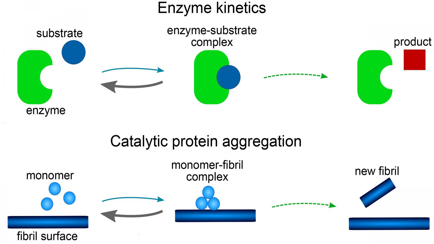 The model consists of a set of mathematical equations, known as rate equations, that describe how protein aggregate concentrations change over time. Each reaction step in the model is shown to be analogous to those in reactions involving enzymes. The role of the enzyme is played by either the tip or side of a growing fiber or, possibly, a surface of the reaction vessel.
