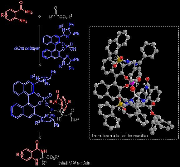 image: A possible mechanism for the formation of chiral N,N-acetal via reaction between 2-aminobenzamide and α-ketoester in presence of chiral bis(imidazoline)-phosphoric acid catalyst
