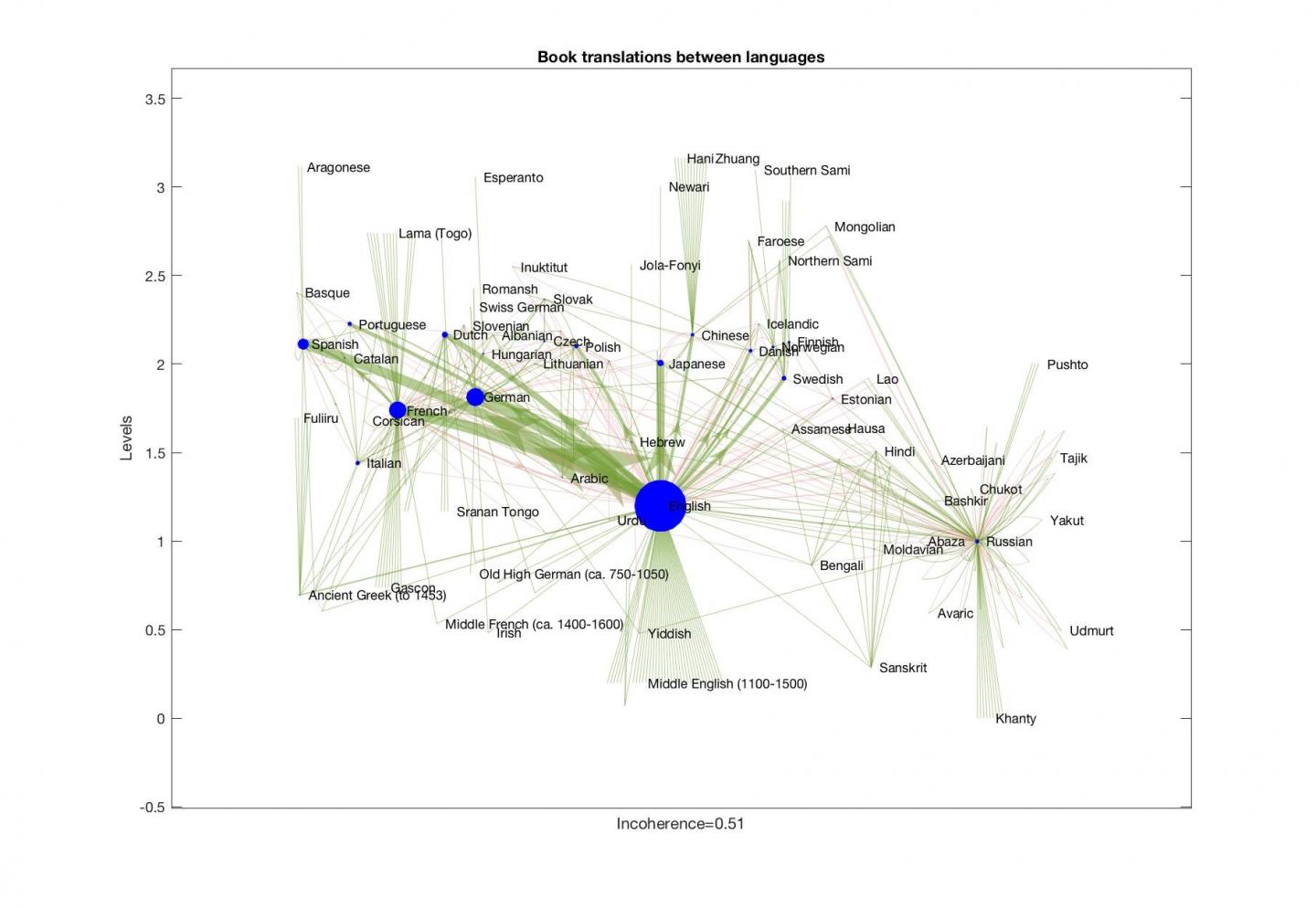 image: Global book translation network plotted with new trophic level vertically. Edges and edge weights represent the number of books translated from source into target language. Upward arrows are plotted green and downward arrows red. Node size is proportional to the sum of incoming and outgoing weights.
