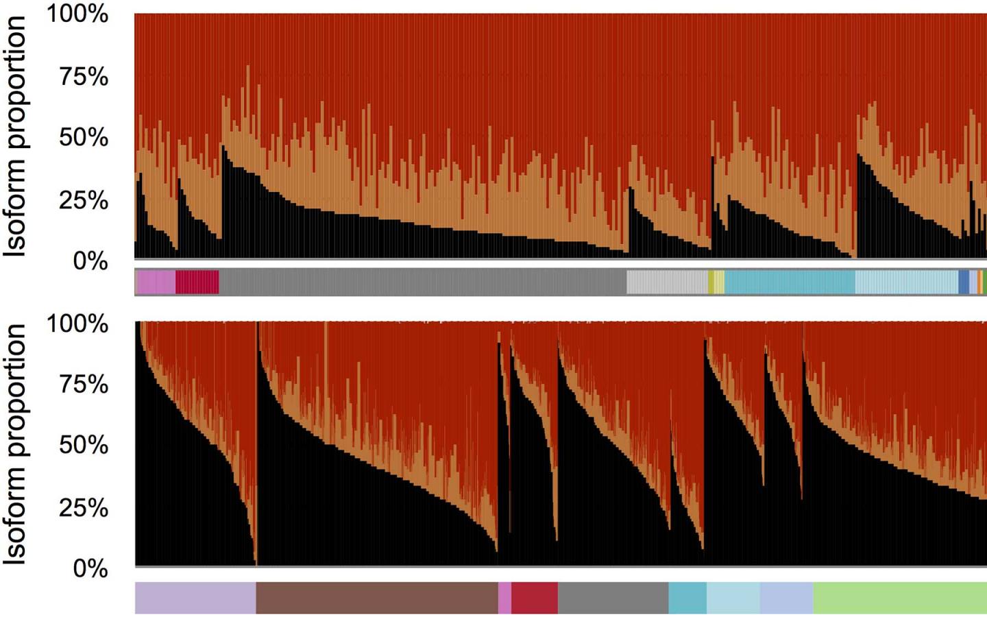 image: Different versions, or isoforms, of messenger RNAs generated by the human AFMID gene, are represented, showing their relative prevalence in cancerous (top) and non-cancerous tissue (bottom), sampled from throughout the body. Black peaks, representing the normal variant found in adult cells, are much lower in cancerous tissue than in normal tissue. The reverse is true of variants color-coded orange and red, which serve as biomarkers in liver cancer.