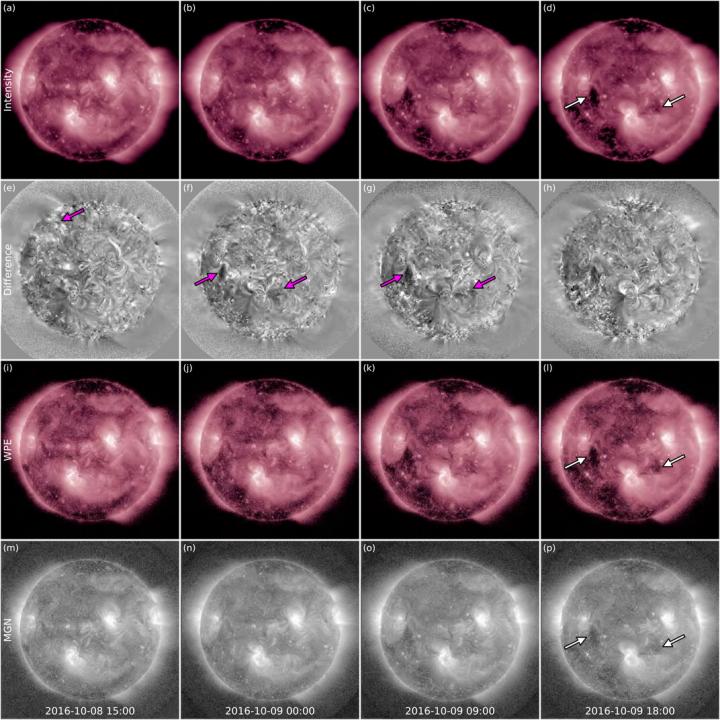 1st column: 08 Oct 2016 15:00 UTC. 2nd column: 09 Oct 2016 00:00 UTC. 3rd column: 09 Oct 2016 09:00 UTC. 4th column: 09 Oct 2016 18:00 UTC. First row: unprocessed images. Second row: Difference images comparing EUV intensity to 12 h earlier. Third row: Images after Wavelet Packets Equalization (WPE), an image processing method. Fourth row: Images after Multi-scale Gaussian Normalization (MGN), another image processing method. Arrows denote dimmings and brightenings on the Sun's disc, previously overlooked but revealed with the new method.