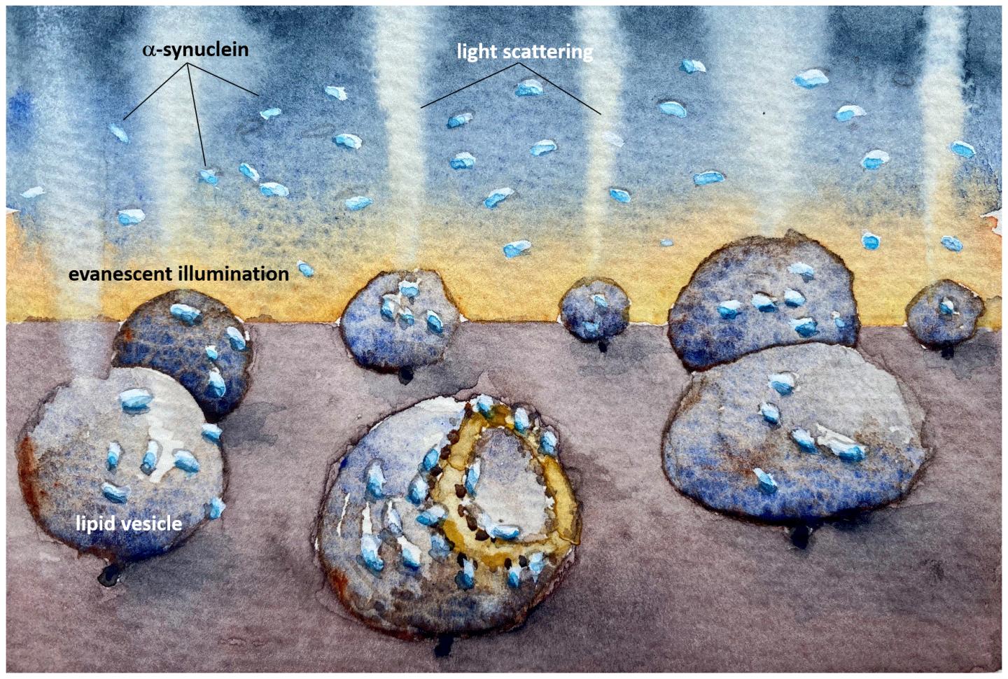 image: An illustration showing how the mitochondria-imitating lipid vesicles are damaged by the Parkinson's protein alpha synuclein. The light scattering reveals how the membrane is destroyed even at very low, nanomolar, concentrations, where proteins do not aggregate to clumps before they bind. The watercolour illustration was created by research Fredrik Höök