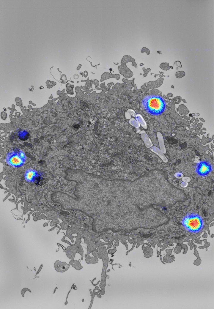 The method pioneered in this study, which combines three types of imaging (correlated light, electron and nano-scale ion microscopy), allows researchers to visualise the distribution of TB drugs in Mtb-infected human macrophages at high resolution, for the first time.