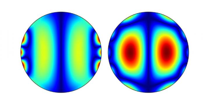 image: Magnetic simulations for magnetic disks measuring 0.5 micrometres in diameter. The spatial distributions of dynamic magnetization in permalloy (left) and cobalt and nickel (right) can be seen.