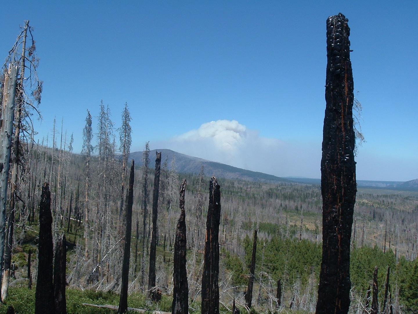 image: Charred trees from the 2003 B&B complex fire are seen in the foreground as the 2007 Warm Springs Lightning complex fire burns.