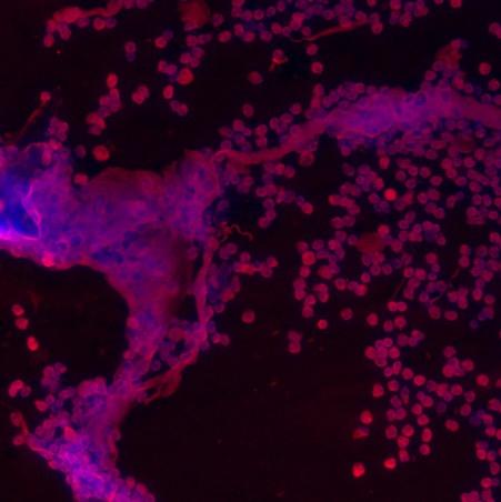 image: Seen here are the white blood cells (neutrophils) in the spinal fluid during bacterial meningitis. The nuclear material DNA is stained blue and proteins in neutrophils are stained red. The large aggregates as represented by overlapping areas of blue (DNA) and red (protein) portrays the extracellular DNA-protein networks called neutrophil extracellular traps (NETs). NETs are released as a defence response against invading bacteria in bacterial meningitis.