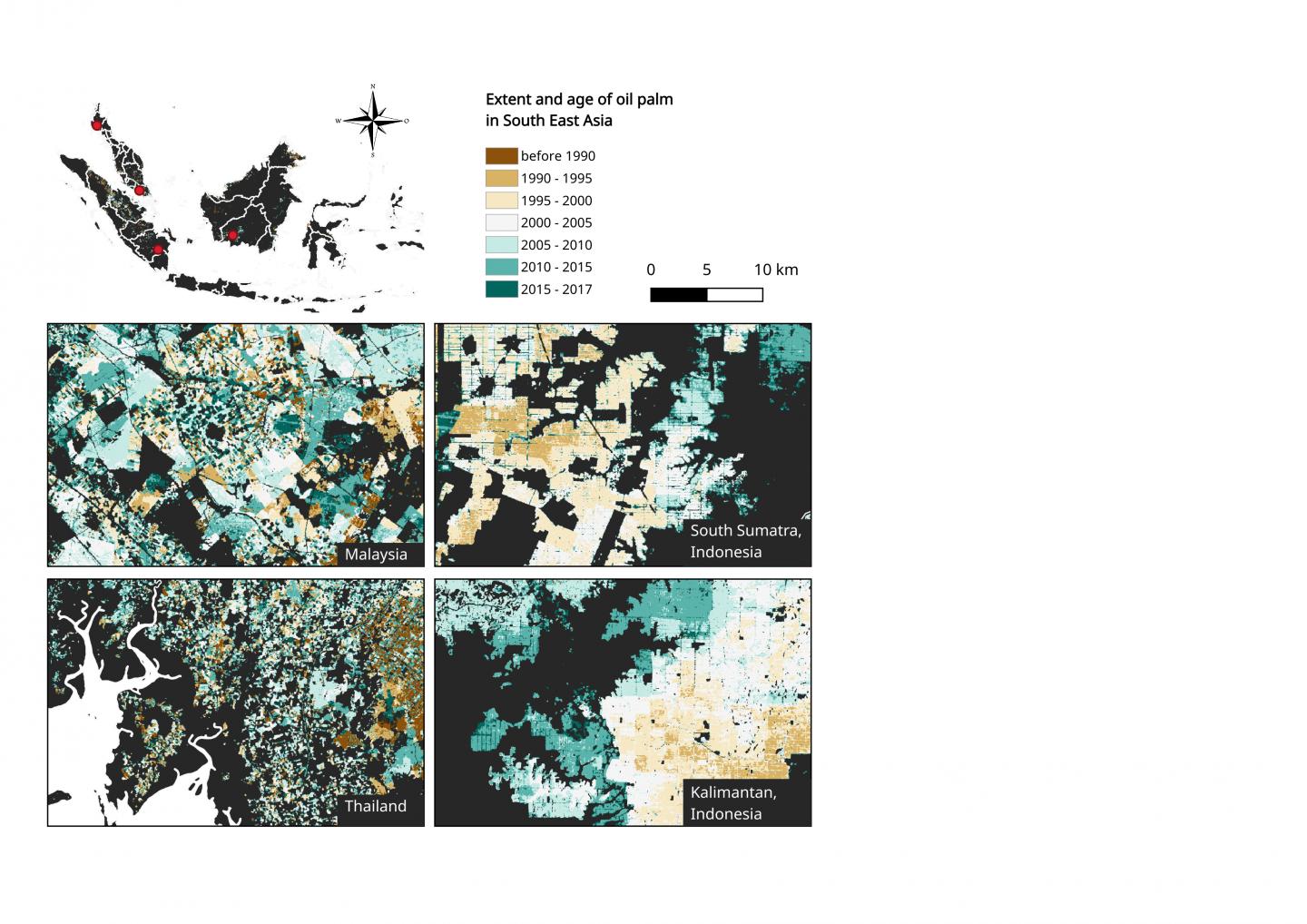 While oil palm extent has been mapped before, this paper uses Sentinel 1 satellite data in combination with other data sets to map extent, along with time series from the Landsat archive to derive the year of plantation detection (which is a proxy for productive age of the plantations). This additional information is valuable for examining questions related to oil palm expansion over the last two decades, as well as the ability to calculate yields from the age information. (Yields increase during the plant's youth phase in the first seven years, reach a plateau during the prime age of 7-15 years, and then slowly start to decline before palms are replaced at the age of 25-30 years.) Therefore, knowing the exact extent and age of plantations across a landscape is crucial for landscape-level planning to allow for both sustainable oil palm production and forest conservation.