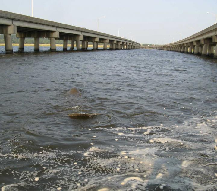 image: A manatee swims between the spans of the Mobile Bay Bridge in lower Alabama.
