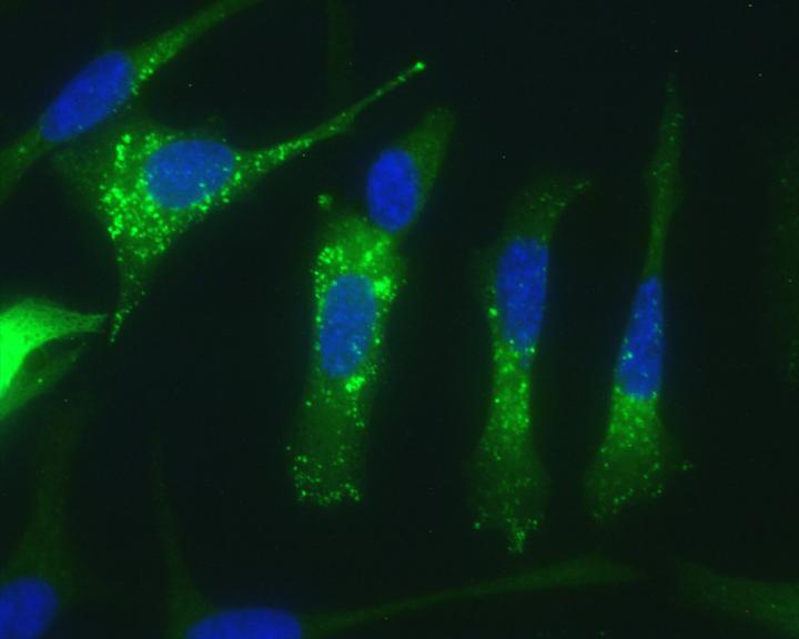image: Human adenocarcinoma pancreatic cancer cells showing increased autophagy (green dots) in response to ABTL0812 treatment