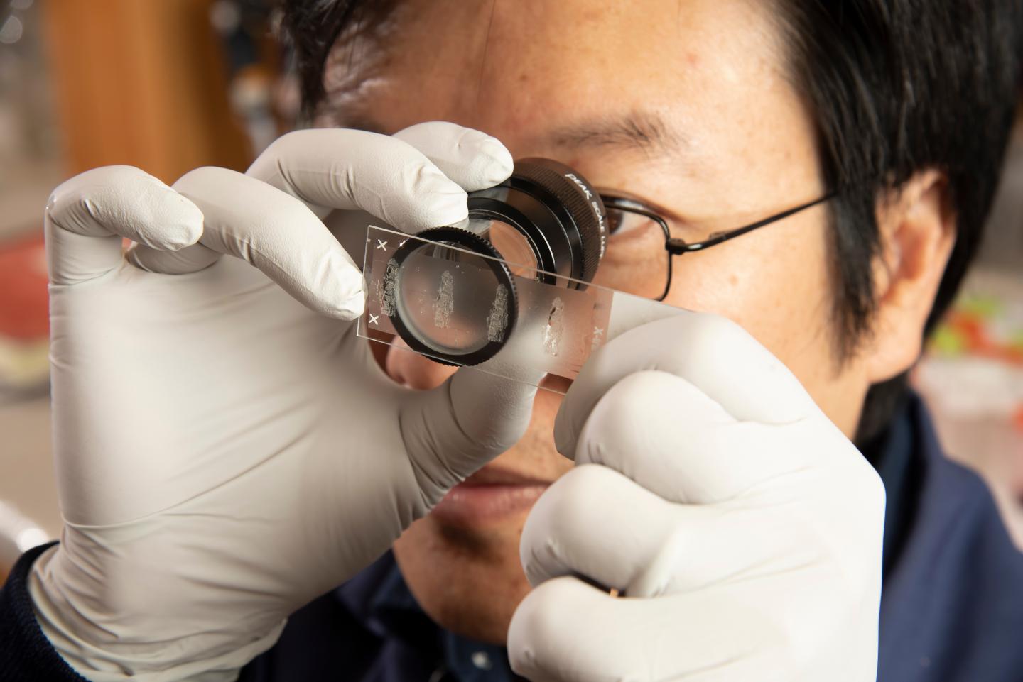 image: Yu-Ru "Vernon" Shih, a research scientist at Duke University, takes a close look at the tissue integrity of vertebral sections of a mouse with osteoporosis that has been treated by targeting a cell receptor.