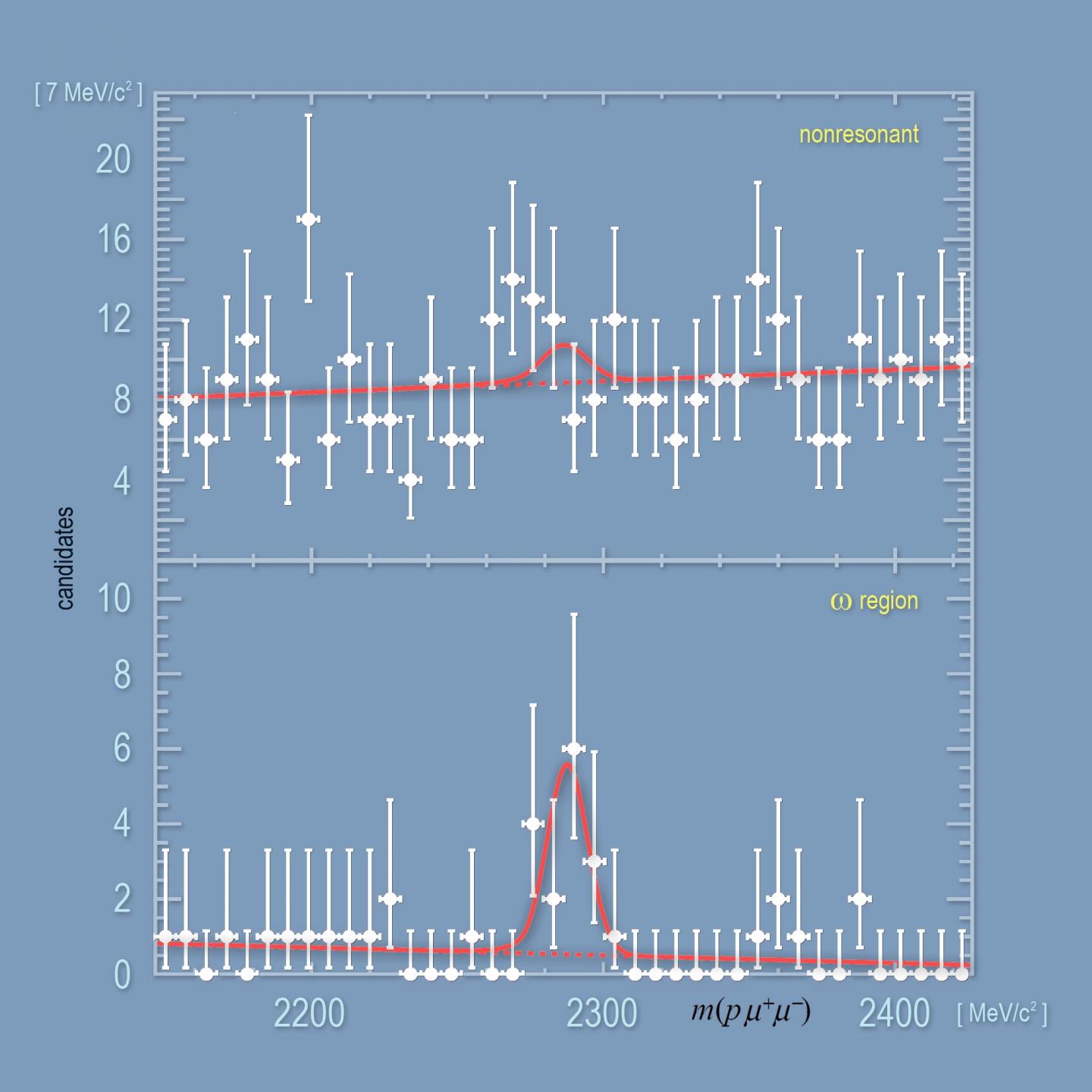 image: Baryons containing a charm quark can decay at once into a proton and two muons. Using data from the LHCb experiment, scientists from the Institute of Nuclear Physics of the Polish Academy of Sciences in Cracow have shown that in these extremely rare processes there are still no signs of the 'new physics'. The signal of the nonresonant decay is visible at the top, the signal of the resonant decay into a proton and omega meson is presented below.