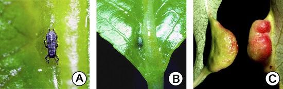 image: A, Fundatrix aphid inducing a gall near the base of the midvein on the upper surface of a poplar leaf. B, Young gall forming near the base of the midvein on the upper leaf surface. The fundatrix (approximately 0.6 mm long) moves back and forth in the gall depression (approximately 3 mm long) adjacent to the midvein continually probing the leaf tissue with her stylet and, within about 3 days, is completely enclosed in gall tissue. C, Side view of fully developed galls that have formed on the underside of the leaf from the activity of the fundatrix on the upper leaf surface.