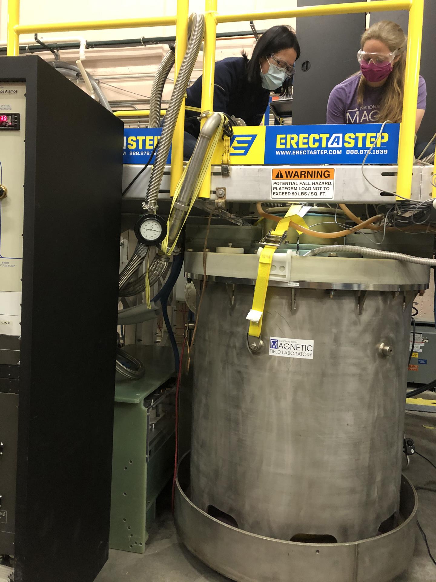 image: You Lai (left) and Johanna Palmstrom (right) use the new duplex magnet at the Los Alamos MagLab Pulsed Field Facility. The same magnet was recently used for the first time in a series of experiments on the exotic Kondo insulator YbB12.