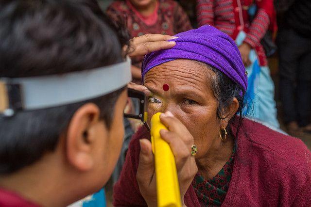 image: Bijaya Paudel, Trachoma Grader, checks the eye of Maiya Dani for clinical signs of trachoma.