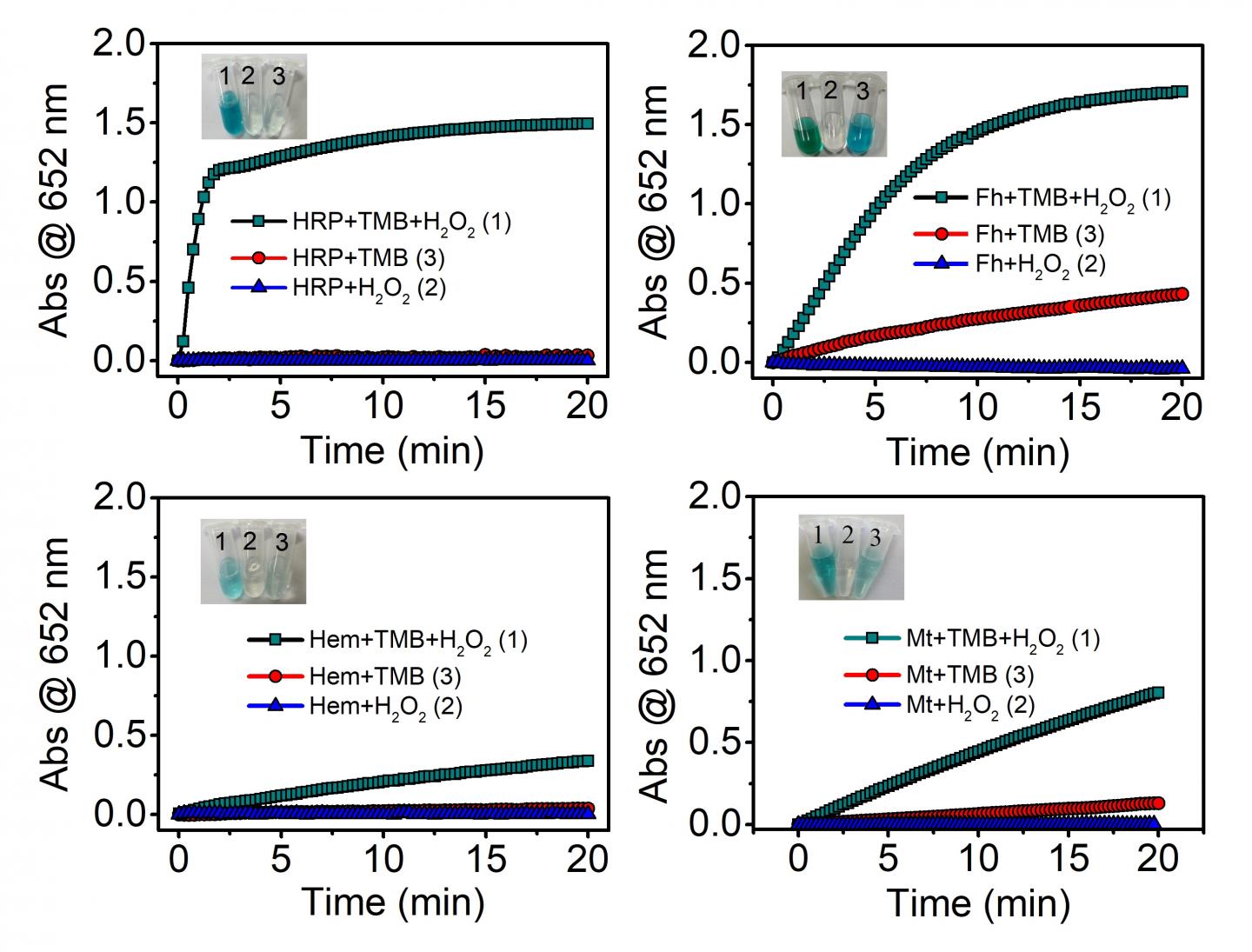 image: Colorimetric reaction catalyzed by the peroxidase-like activity of natural enzymes (HRP) and mineral nanozymes with substrates (TMB). HRP, horseradish peroxidase. TMB, 3,3?,5,5?-tetramethylbenzidine. Fh, ferrihydrite. Hem, hematite. Mt, magnetite.