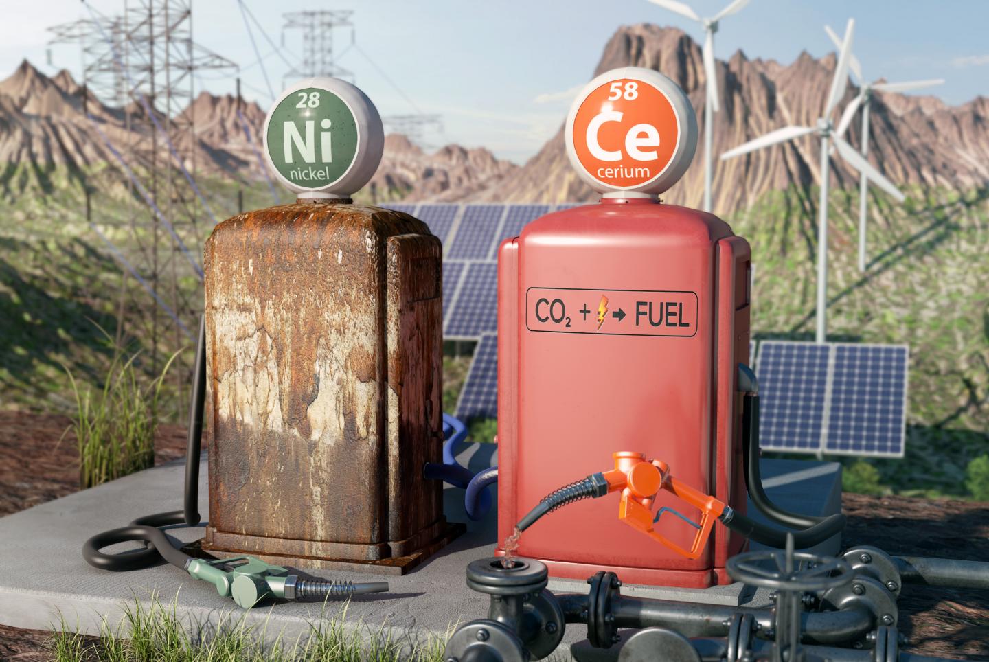 image: Artistic representation of a nickel-based electrode as a broken down fuel pump and of a cerium-based electrode as a new, productive pump.
