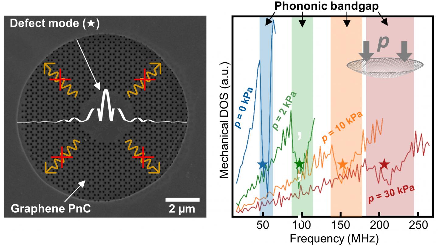 Jan N. Kirchhof, first author of the study now published in Nano Letters, calculated the vibrational properties of this phononic crystal. His simulations show that in a certain frequency range no vibrational modes are allowed. Analogues to the electronic band structure in solids, this region is a mechanical band gap. This band gap can be used to localize individual modes to shield them from the environment. What's special here: "The simulation shows that we can tune the phononic system quickly and selectively, from 50 megahertz to 217 megahertz, via applied mechanical pressure, induced by a gate voltage." says Jan Kirchhof.