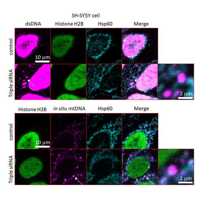 image: Immunostaining: Top panel SH-SY5Y cells transfected with GBA, ATP13A2, and PINK1 siRNAs are stained for dsDNA (magenta), histone H2B (green) and Hsp60 (turquoise). White arrows indicate cytosolic dsDNA of mitochondrial origin. Triple siRNA: Knockdown of GBA, ATP13A2, and PINK1 expression with siRNAs. Coimmunostaining: Bottom panel In situ hybridization of mitochondrial DNA and coimmunostaining for histone H2B (green) and Hsp60 (turquoise) in SH-SY5Y cells transfected with GBA, ATP13A2, and PINK1 siRNAs. White arrows indicate cytosolic dsDNA of mitochondrial origin. Triple siRNA: Knockdown of GBA, ATP13A2, and PINK1 expression with siRNAs.