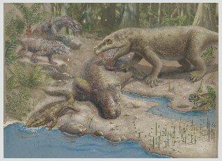 image: The plant-eating pareiasaurs were preyed on by sabre-toothed gorgonopsians. Both groups died out during the end-Permian mass extinction, or "The Great Dying."