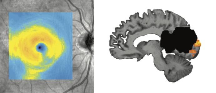 image: The left image shows degeneration that typically occurs in the eye (lower right corner) after a patient has a stroke in the visual processing area of the brain. The area of degeneration corresponds to the location of blind areas of the patient's visual field. Carnegie Mellon and University of Rochester researchers found the eye is less likely to degenerate when the brain continues to respond to visual stimuli despite the patient's blindness from the stroke. The right image shows lesion in black and visual cortex activity to stimuli presented in blind areas of the patient's visual field in orange.