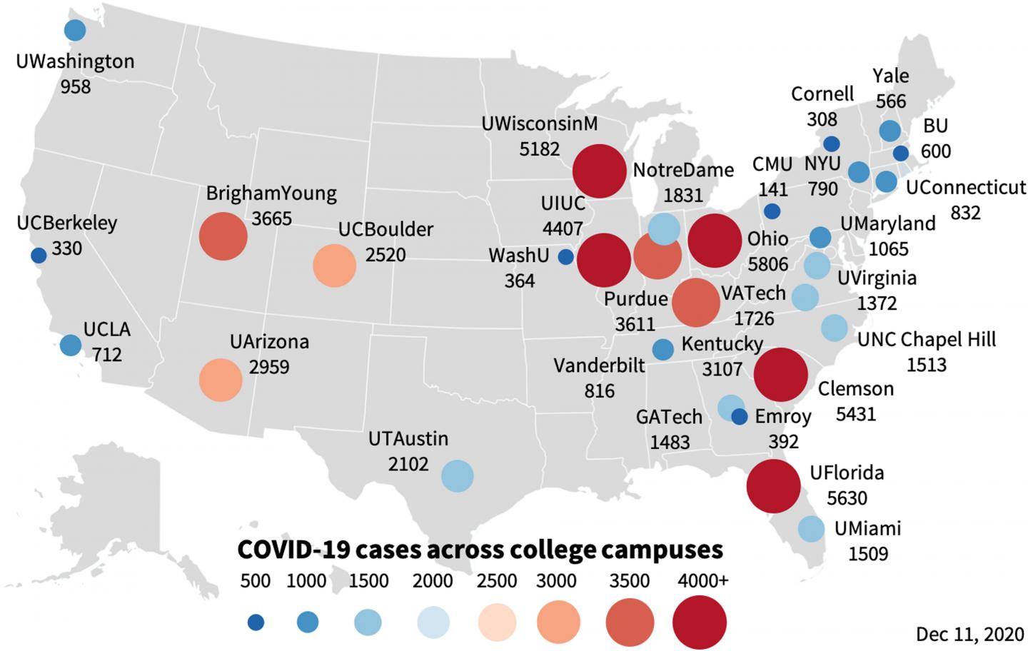 In some colleges, one in five students had been infected with the virus by the end of the fall term. Four institutions had over 5,000 cases.