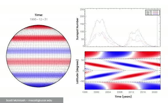 video: LEFT: Oppositely charged magnetic bands, represented in red and blue, march toward the equator over a 22-year period. When they meet at the equator, they annihilate one another.