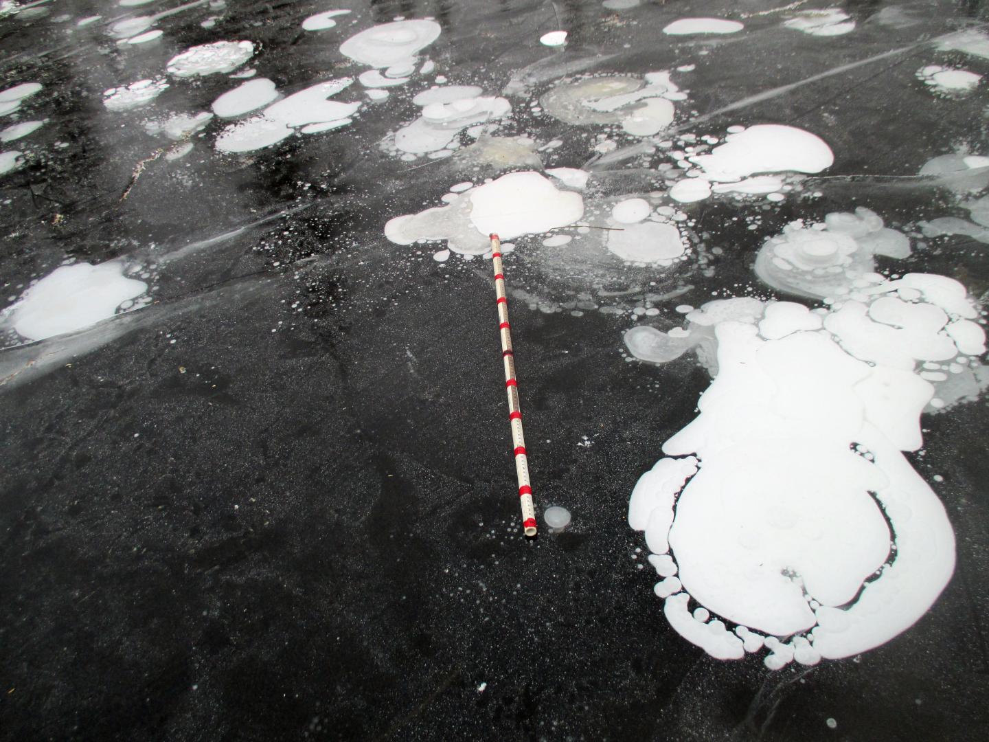 image: Methane ebullition bubbles form in early winter lake ice in Interior Alaska. A yardstick is included for scale.