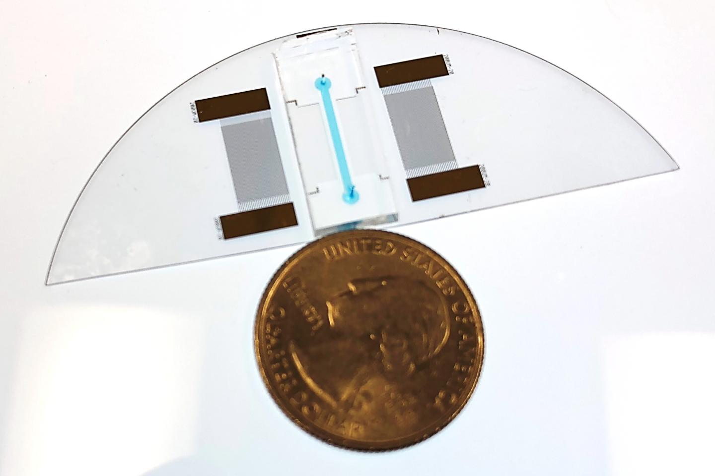 image: An Acousto Thermal Shift Assay "lab-on-a-chip" device shown next to a quarter for size comparison.
