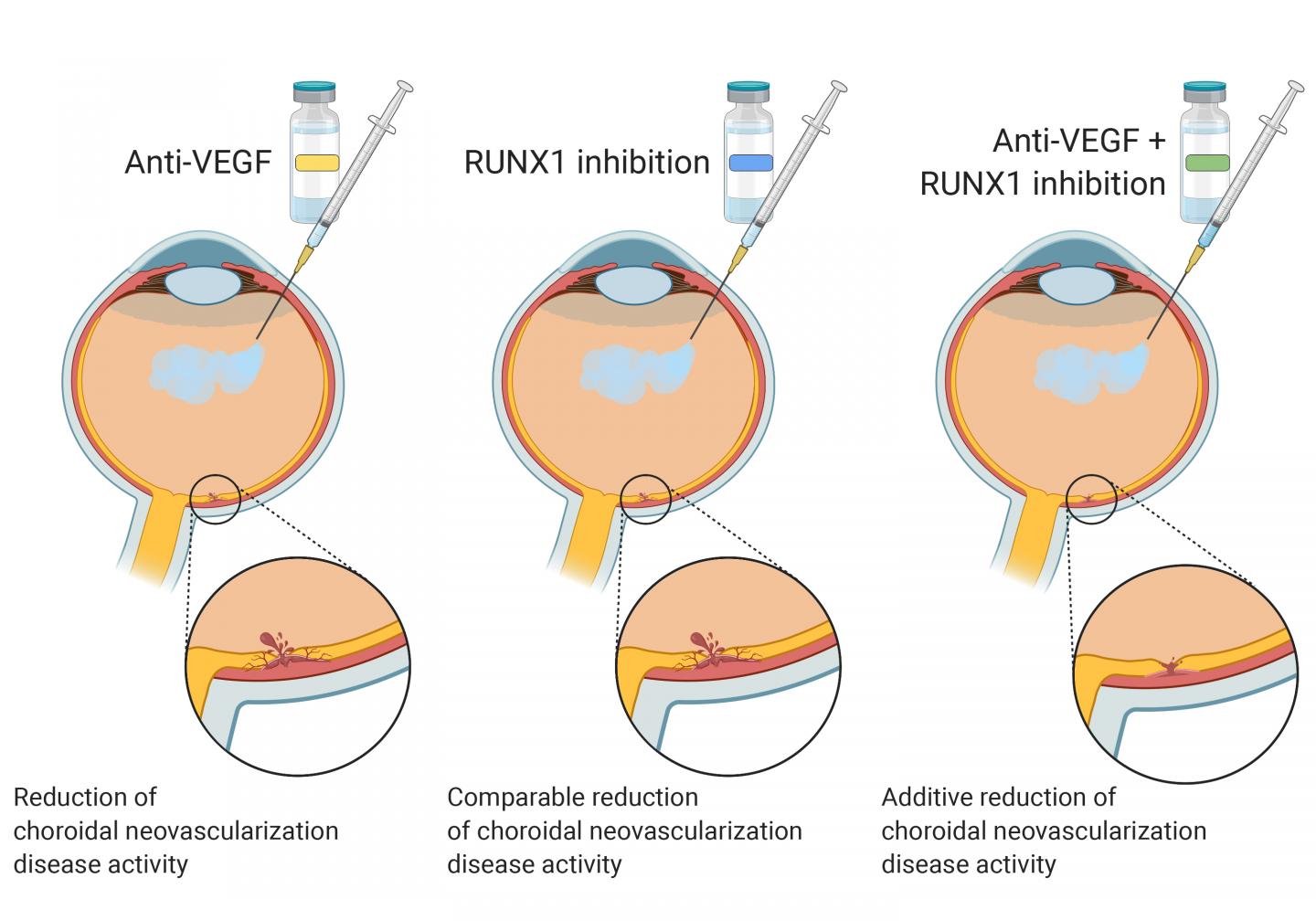 Researchers induced CNV lesions in mice. Immediately thereafter the mice received a single intravitreal injection of saline, aflibercept (a Food and Drug Administration-approved treatment for VEGF), the RUNX1 inhibitor Ro5-3335, or a combination of Ro5-3335 and aflibercept. A single intravitreal injection of Ro5-3335 alone significantly decreased the CNV lesion size seven days after induction of the CNV lesions. The combination of Ro5-3335 and aflibercept reduced vascular leakage more effectively than aflibercept alone.