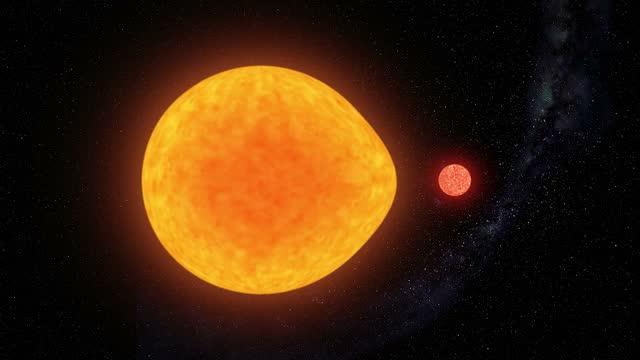 The orbital period of the binary system, at less than two days, is so short that the larger star is being distorted into a tear-drop shape by the gravitational pull of the companion.