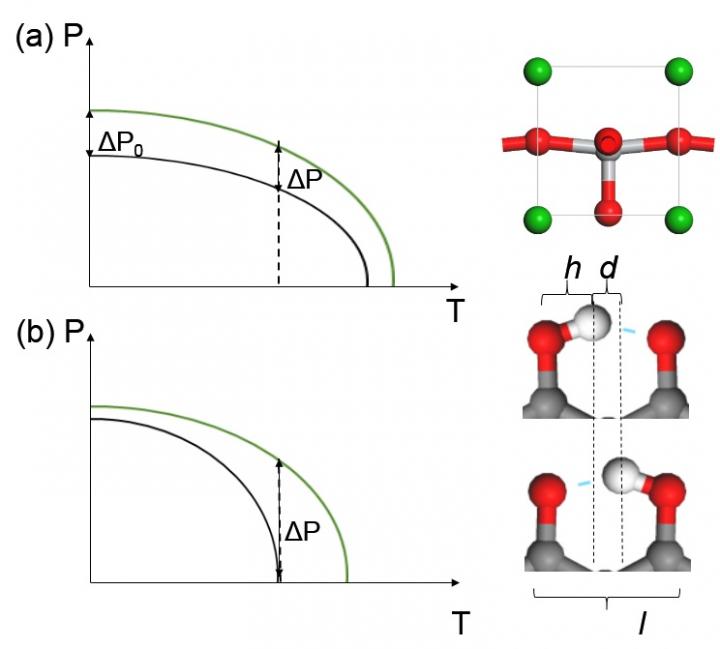 image: The change of polarization upon a strain in (a) perovskite ferroelectrics and (b) HP ferroelectrics, where the black/green curve represent the dependence of polarization on temperature before/after a tensile strain is applied. Red, white and grey spheres denote O, H and C atoms respectively.