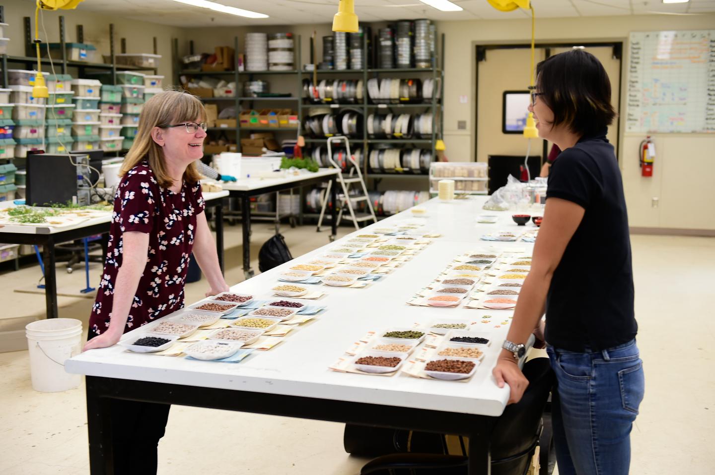 image: USask plant researcher Kirstin Bett (left) discusses beans and pulses with Crystal Chan, former project manager
