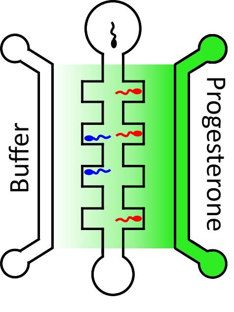 Sperm use chemotaxis, or movement toward increasing or decreasing concentrations of a substance, to guide their journey through the fallopian tube to the egg. Progesterone is present at high concentrations in the fluid that surrounds the egg, and previous studies have indicated that the hormone can attract and activate spermatozoa of some mammalian species. Scientists have used microfluidic devices -- plastic or hydrogel chips with tiny channels through which liquids flow in a highly controlled manner --to study sperm chemotaxis. But the devices have had various limitations, such as the need for pumps to drive the flow of fluid, which could affect sperm motility. Loes Segerink, Johanna Berendsen and colleagues wanted to develop an improved, pump-free microfluidic device that could quickly identify small differences in the chemotactic behavior of sperm.