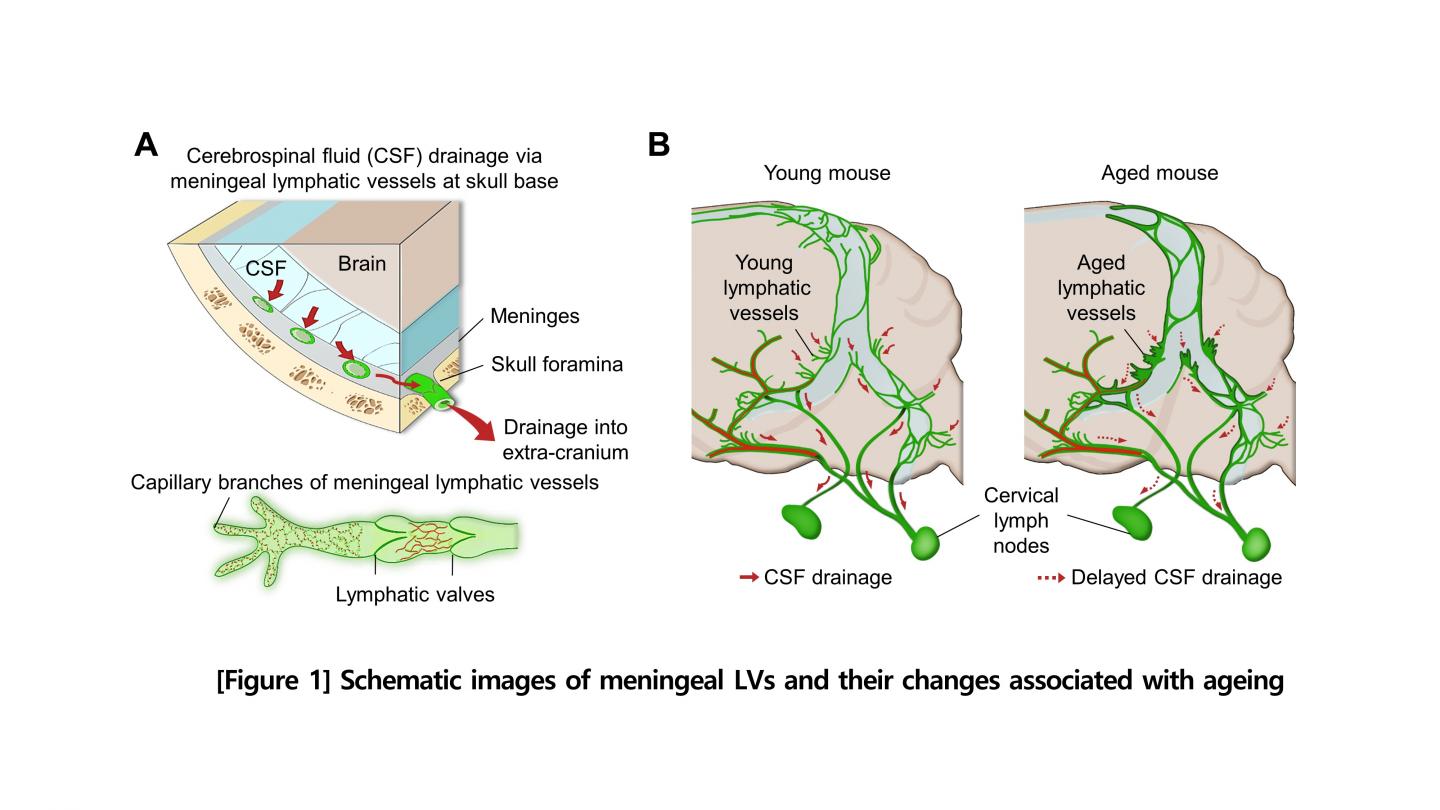 image: The waste of the brain is drained by the CSF and exits the brain through the mLVs at the skull base (basal mLVs). The basal mLVs are connected to the lymphatic system through a hole in the skull (skull foramen) and they have abundant lymphatic vessel branches with a finger-like protrusions. There exists a valve within the vessel structure of the basal meningeal lymphatic vessels that allows the lymph to flow in one direction. In particular, the basal meningeal lymphatic vessels are anatomically located in close proximity to the CSF and have structures favoring the absorption and drainage of the CSF. The CSF is cleared outside the central nervous system into the deep cervical lymph nodes after drainage from the basal meningeal lymphatic vessels. Figure B is a schematic diagram showing that the basal mLVs undergo a severe deformation process and that their functionality is impaired with age.