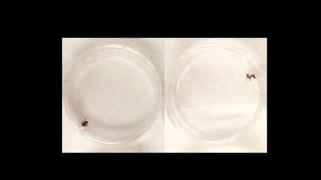 video: Unstable copulation (right) due to mismatched genitalia in heterospecific mating between Drosophila suzukii and its sibling species. Stable copulation (left) between D. subpulchrella is shown for comparison.