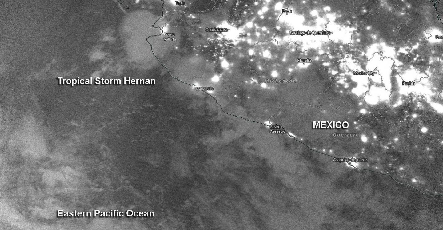 Nighttime imagery from NASA-NOAA's Suomi NPP satellite revealed the Eastern Pacific Ocean's Tropical Storm Hernan along the coast of western Mexico. By the weekend, Hernan is expected to absorb nearby Tropical Storm Iselle.