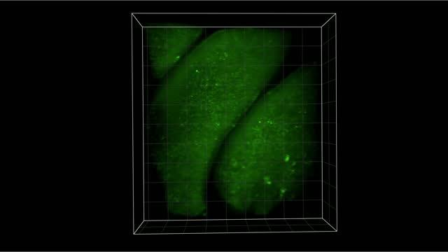 video: Mouse olfactory epithelial cells respond in real time to odor mixtures. When individual cells become activated by odors their green fluorescence increases. These images were obtained through the 3D SCAPE microscopy system, which was developed with funding from the NIH BRAIN Initiative.