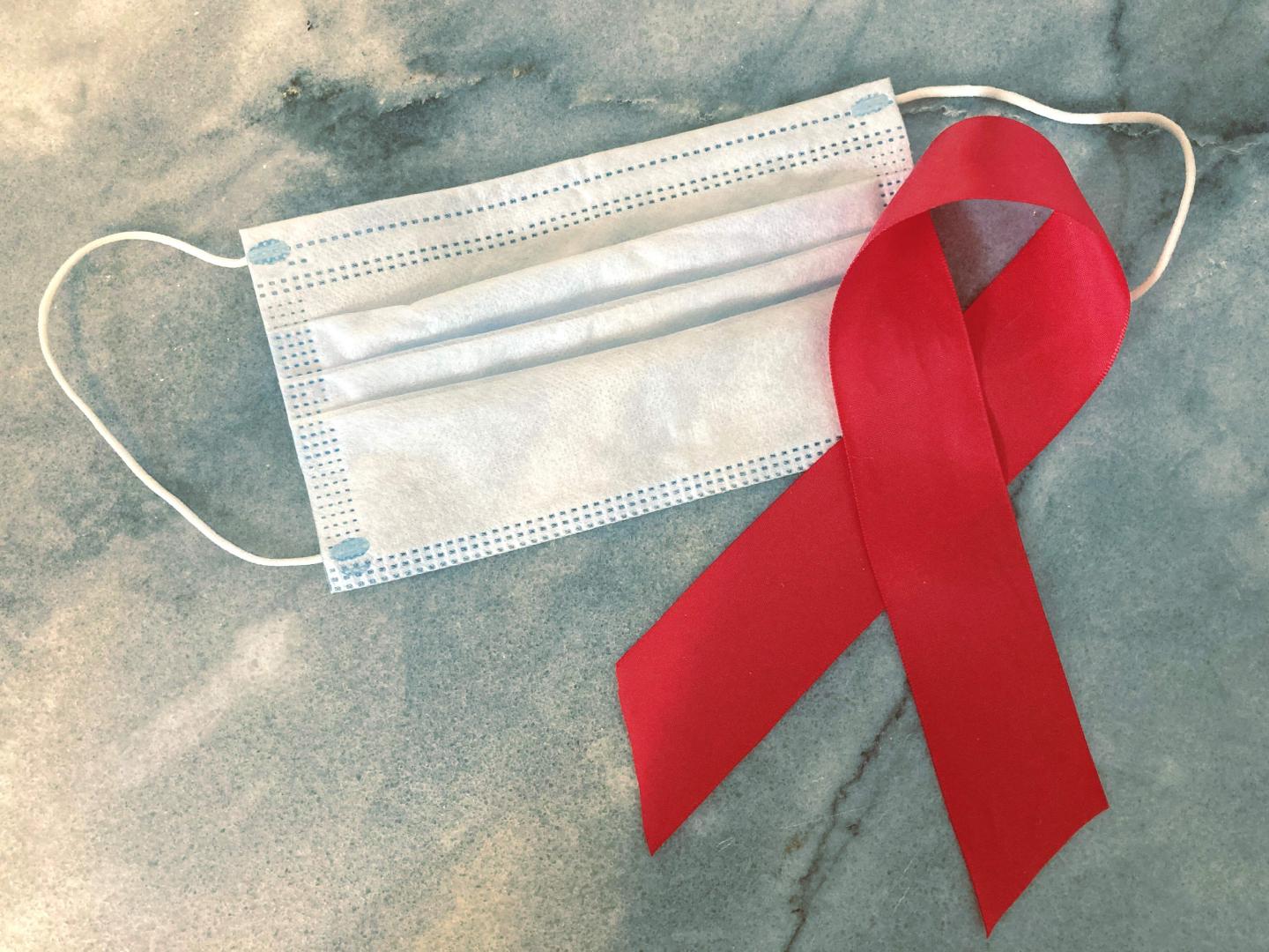image: A surgical mask and an HIV/AIDS awareness ribbon.