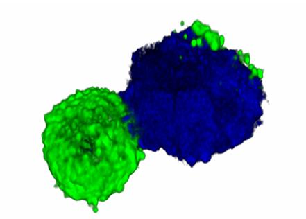 image: This is a representative 3D-reconstructed image of a doublet of a T cell (CD3, green) and a monocyte (CD14, blue).
