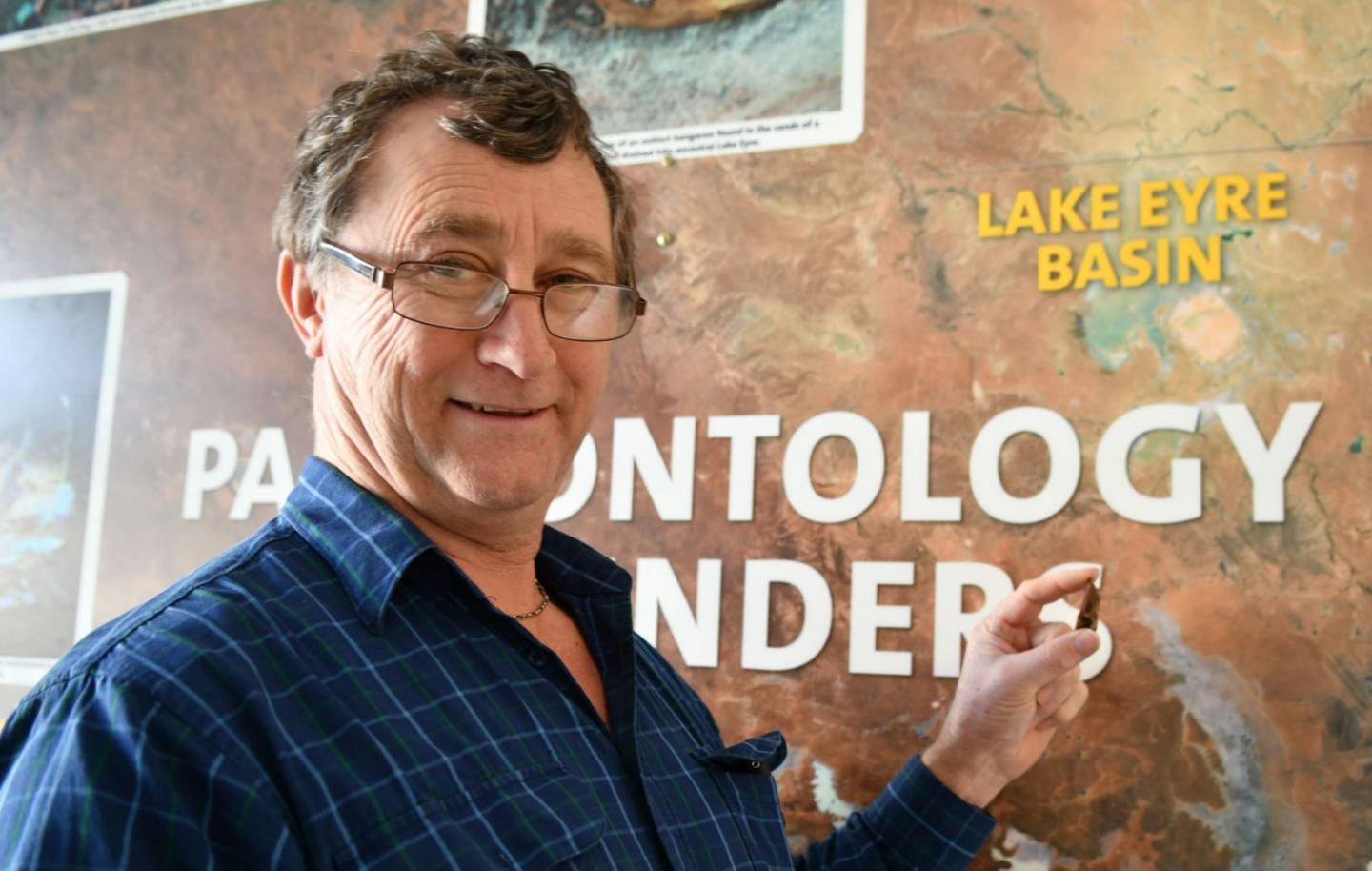 image: Flinders University vertebrate palaeontologist Associate Professor Trevor Worthy with a fragment of a fossilised drumstick from another large extinct Australian bird, a stork (Ciconia nana), as well as an African flamingo leg bone.
