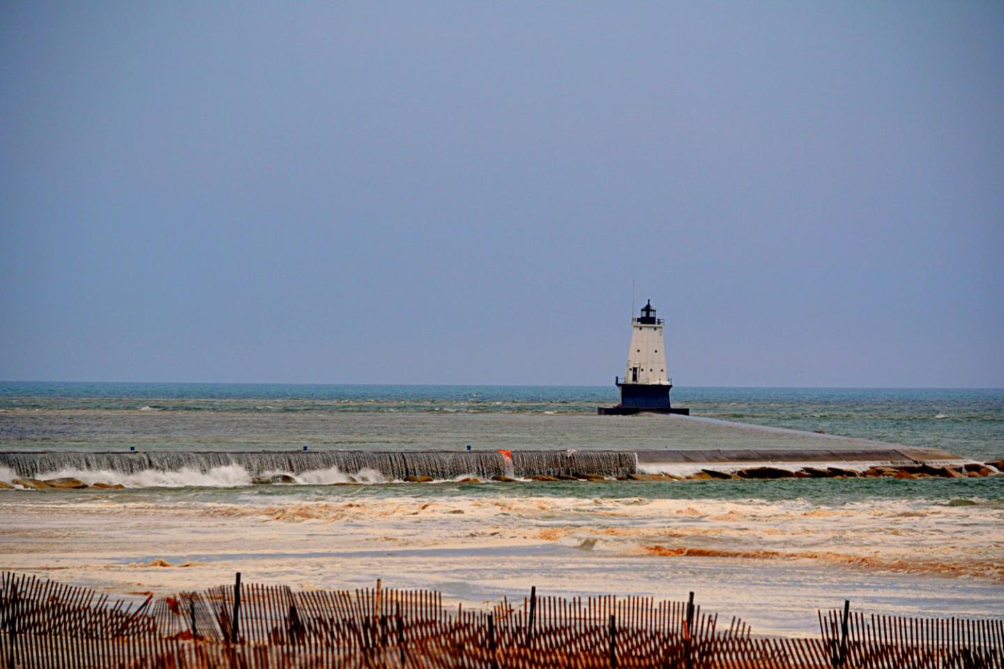 image: The Lake Michigan meteotsunami unleashes a waterfall over the breakwater during the event near the Ludington, Michigan, Breakwater Lighthouse on April 13, 2018.