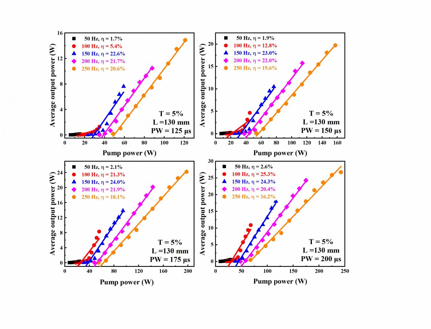 image: Fig. 2. Average output power of LD side-pumped Er:YAP laser versus pump power at different working frequencies and pump pulse widths.