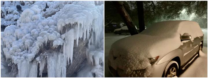 image: Left: Frozen waterfall in a rural area west of Beijing, China (photo taken by Fei Zheng on Feb 17); Right: A snow-capped car in Austin, Texas USA (photo taken by Zong-Liang Yang on Feb 15).