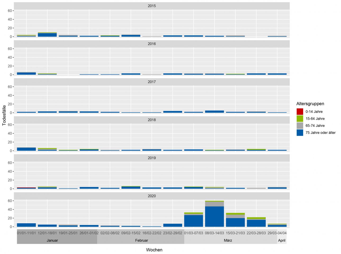 image: Number of deaths per week in Nembro (early January to mid April 2020), by age group. Data: Italian National Institute of Statistics (ISTAT, www.istat.it).